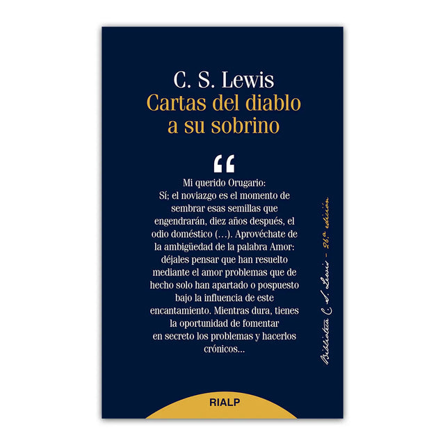 La originalidad de su planteamiento, el acertado estilo literario y la agudeza de su autor, hacen de este título uno de los más apreciados y brillantes de Lewis. El libro está compuesto por un conjunto de cartas breves que un demonio ya anciano escribe a un demonio joven -su sobrino- para enseñarle el oficio de tentar a los humanos. A través de esa correspondencia se van planteando importantes cuestiones que afectan a la vida de todos. Lewis describe con gran acierto las corrientes de pensamiento, las costumbres y hábitos de vida más extendidos en el mundo actual, y alterna esa descripción con una crítica certera. Sus novedosos razonamientos se exponen en un estilo ingenioso y ameno, muy atractivo para el lector medio. C. S. Lewis nació en Irlanda en 1898, se educó en el Malvern College durante un año, y luego privadamente. Fue Tutor en el Magdalen College y profesor de Literatura en Cambrigde. Ateo en su juventud, describió su conversión al cristianismo como una experiencia que transformó su vida y su obra. Dotado de una inteligencia excepcional y de un ingenio certero y lúcido, ejerció una gran influencia tanto en sus alumnos como en sus lectores. Cultivó con igual maestría el ensayo, la novela y la literatura infantil. Mientras no tengamos rostro, El diablo propone un brindis, Los cuatro amores, El problema del dolor, Mero cristianismo, Lo eterno sin disimulo, El gran divorcio, Si Dios no escuchase, son algunas de sus obras más célebres.