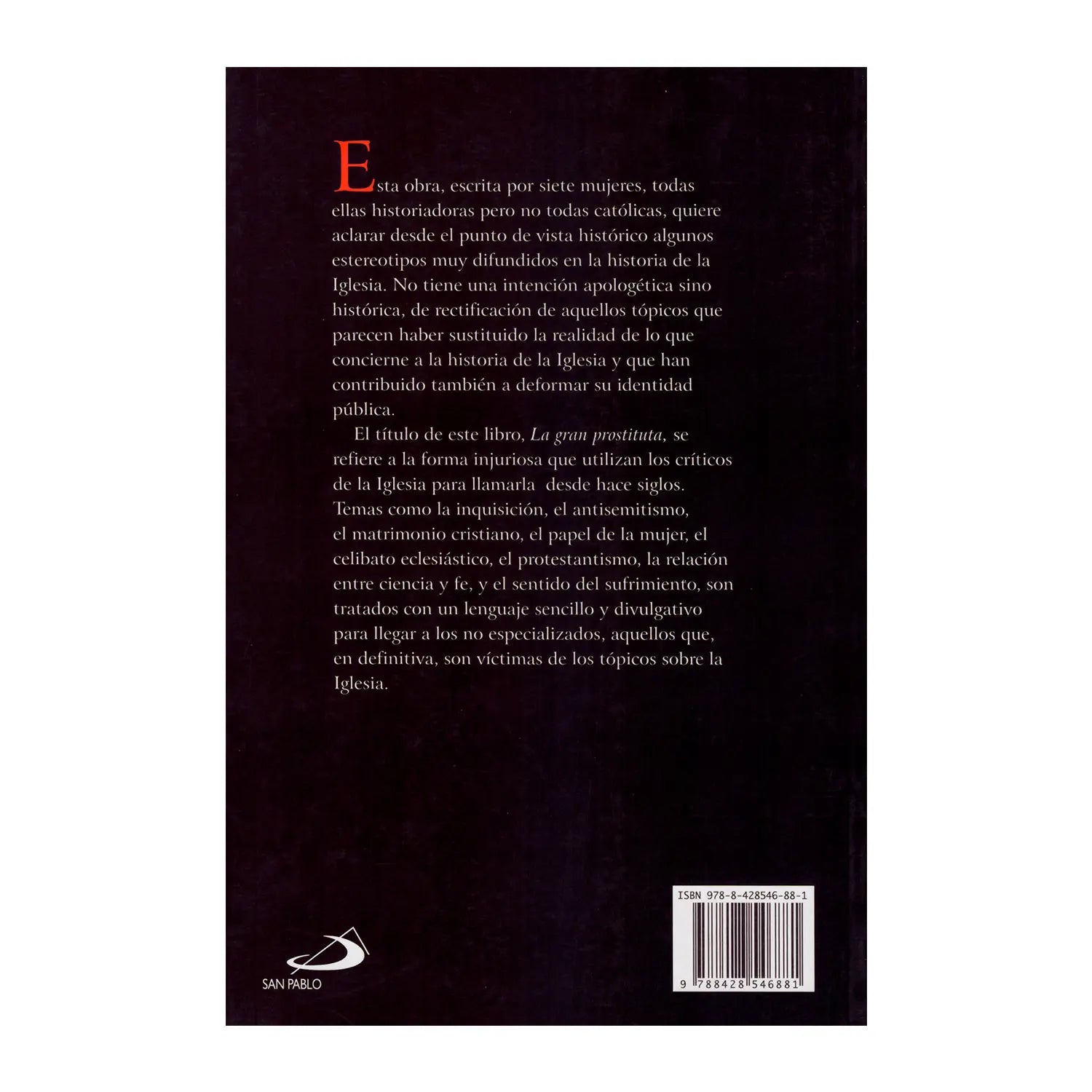 Escrito por siete mujeres, todas ellas historiadoras pero no todas católicas, este libro quiere aclarar desde el punto de vista histórico algunos estereotipos muy difundidos sobre la Iglesia que han contribuido a deformar su imagen pública: la Iglesia como represora mediante la Inquisición, fomentadora del antisemitismo, enemiga del sexo, opresora de la mujer, contraria a la ciencia, deseosa de que los fieles sufran, legisladora de la obligatoriedad del celibato, desviada de la pureza de sus orígenes, anticuada en sus planteamientos y doctrinas. El título del libro, La gran prostituta, se refiere al modo injurioso como la Iglesia es conocida por sus críticos desde hace siglos, insulto que resume en cierto sentido todos estos tópicos. El trabajo de estas historiadoras ha consistido en revisar y depurar estas opiniones, con la intención de hacer una valoración y un debate sobre la Iglesia desde el conocimiento de la verdad histórica.