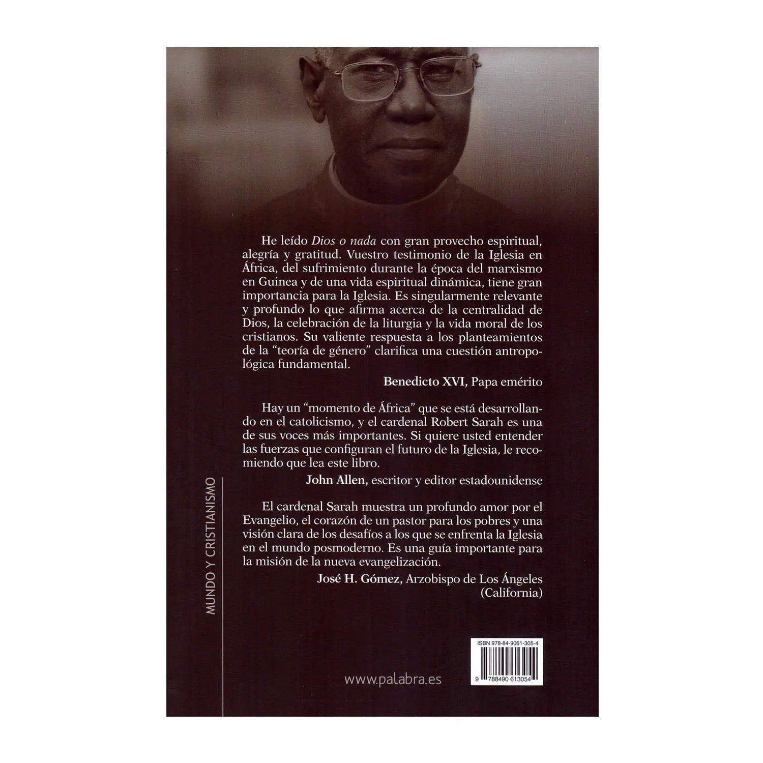 He leído Dios o nada con gran provecho espiritual, alegría y gratitud. Vuestro testimonio de la Iglesia en África, del sufrimiento durante la época del marxismo en Guinea y de una vida espiritual dinámica, tiene gran importancia para la Iglesia. Es singularmente relevante y profundo lo que afirma acerca de la centralidad de Dios, la celebración de la liturgia y la vida moral de los cristianos. Su valiente respuesta a los planteamientos de la "teoría de género" clarifica una cuestión antropológica fundamental. Benedicto XVI, Papa emérito.