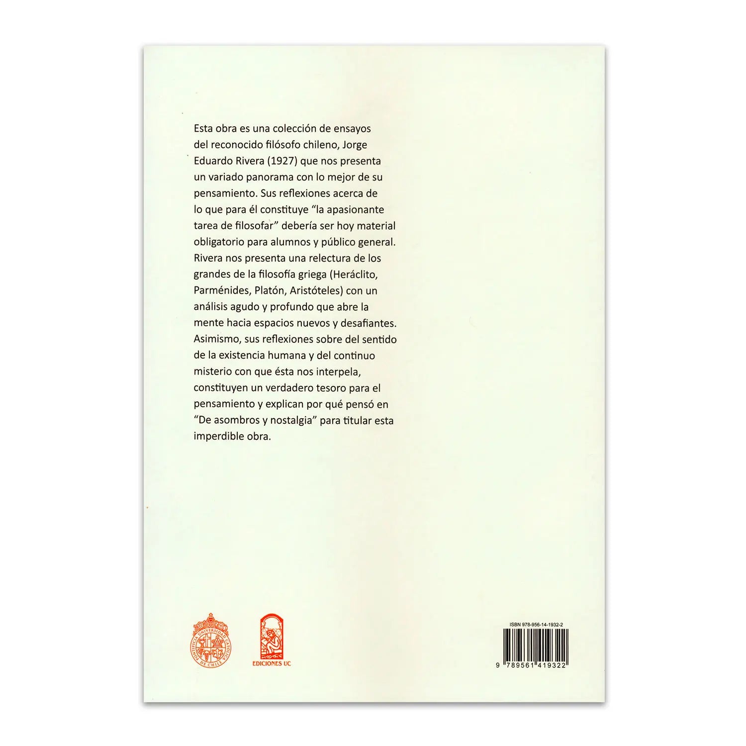 Esta obra es una colección de ensayos del reconocido filósofo chileno, Jorge Eduardo Rivera (1927) que presentan un variado panorama con lo mejor de su pensamiento. Sus reflexiones acerca de lo que para él constituye “la apasionante tarea de filosofar” debería ser hoy material obligatorio para alumnos y público general. Rivera nos presenta una relectura de los grandes de la filosofía griega (Heráclito, Parménides, Platón, Aristóteles) con un análisis agudo y profundo que abre la menta hacia espacios nuevos y desafiantes. Asimismo, sus reflexiones sobre del sentido de la existencia humana y del continuo misterio con que ésta nos interpela, constituyen un verdadero tesoro para el pensamiento y explican por qué pensó en “De asombros y nostalgia” para titular esta imperdible obra.
