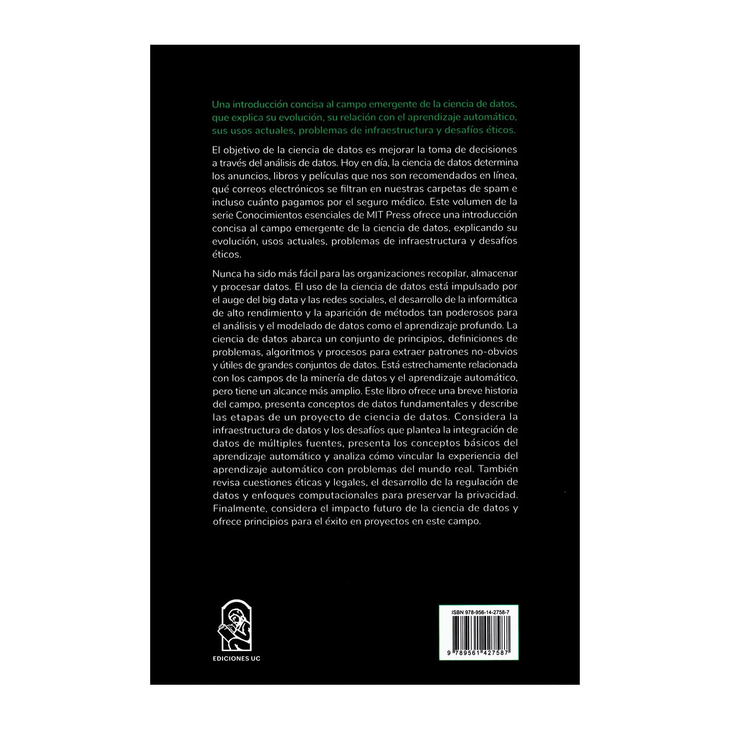 Una introducción concisa a la ciencia de datos, un campo que en virtud de su vertiginosa evolución hoy en día determina las tomas de decisión de las organizaciones, así como los anuncios, libros y películas que nos son recomendados en línea o qué correos electrónicos se filtran en nuestras carpetas de spam. La ciencia de datos abarca un conjunto de principios, definiciones de problemas, algoritmos y también de desafíos éticos y legales, relacionados con el uso de datos y la privacidad individual. El libro también se interna en el impacto futuro de la ciencia de datos y ofrece principios para el éxito en proyectos que se lleven a cabo en esta área.