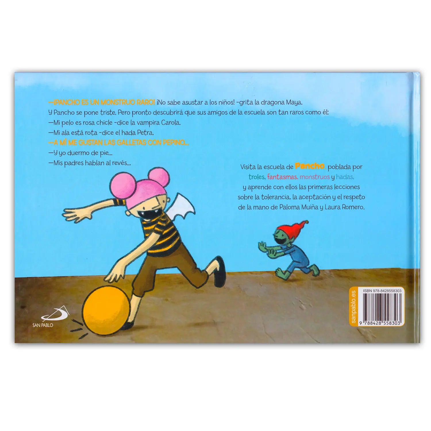 PANCHO IS A STRANGE MONSTER! He doesn't know how to scare children! - shouts the dragon Maya. And Pancho becomes sad. But he will soon discover that his friends at school are as strange as he is: "My hair is bubblegum pink," says the vampire Carola. "My wing is broken," says the fairy Petra. "I LIKE COOKIES WITH CUCUMBER..." "And I sleep standing up..." "My parents speak backwards?" Visit Pancho's school, populated by trolls, ghosts, monsters and fairies, and learn with them the first lessons about tolerance, acceptance and respect from Paloma Muiña and Laura Romero.